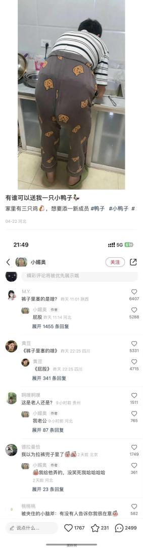 以为裤子里塞的是鸭子。