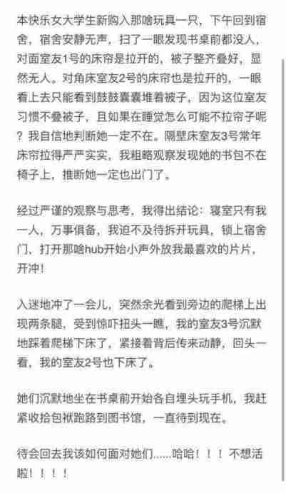女大学生在宿舍玩电动X玩具,没想到室友都在怎么办?