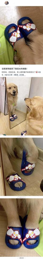当狗狗穿上小朋友的拖鞋。
