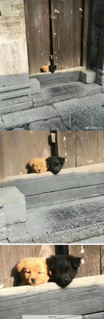 两只小狗挤门缝晒太阳。